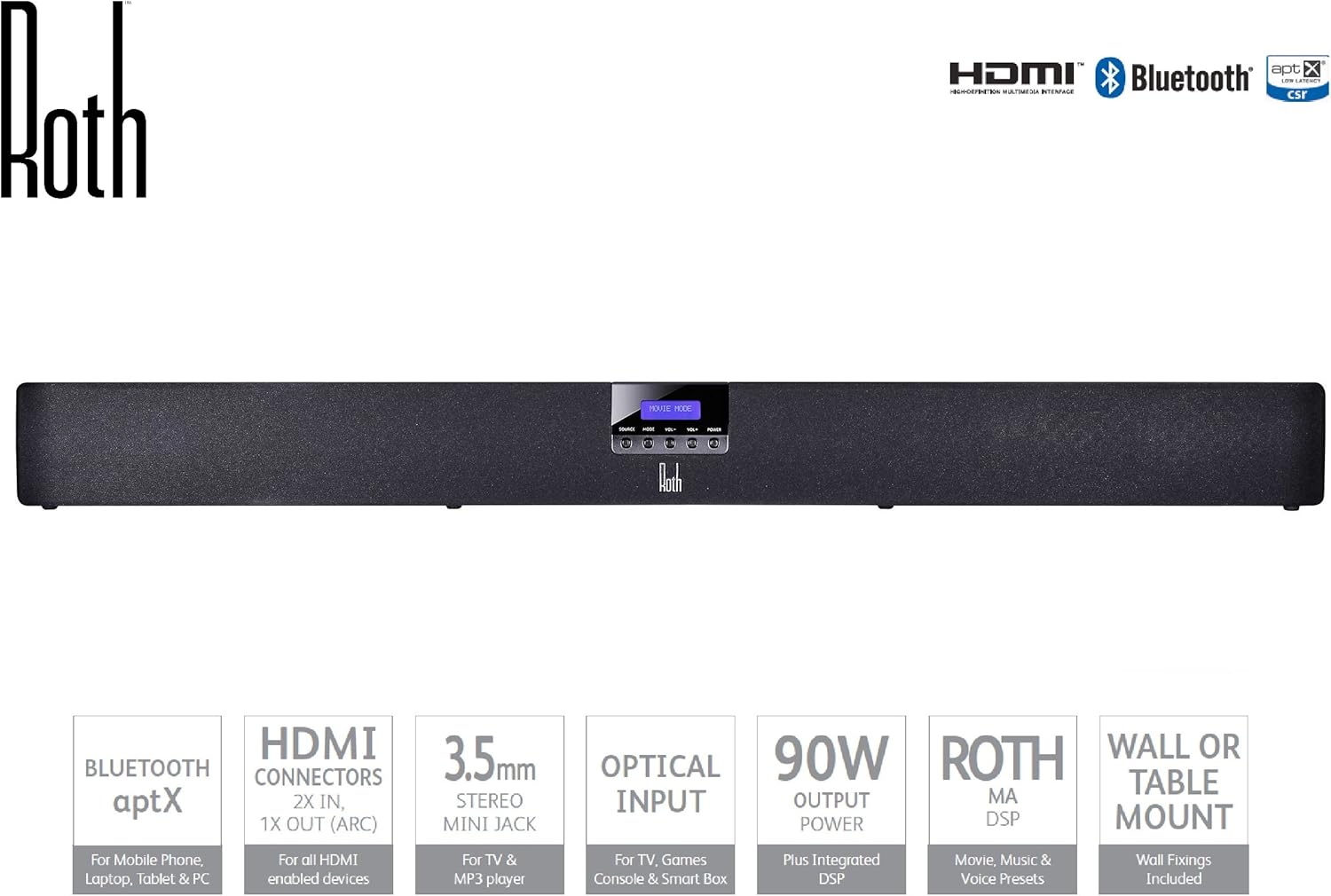 Flat panel TVs look great. But they sound bad. The Roth Sub Zero III has been designed to give you the high definition audio you need to accompany your HD picture. Utilising HDMI (2 in/1 Out, ARC enabled), Optical, Bluetooth and Analogue inputs the Sub Zero III will connect easily to any TV or audio source – even wirelessly from your laptop, mobile ‘phone or tablet. With no need for a separate subwoofer the Sub Zero III has two built-in Ultra-Bass passive drivers, 2 bass drivers and 2 full range drivers, allowing full frequency range audio in a single discrete unit. Designed to perform in any room large or small, the Sub Zero III will bring new life to your TV and you’ll hear detailed audio like never before. Using Roth MA DSP sound processing, you’ll also get a tremendous home cinema experience. The Sub Zero III can be wall or table mounted and at just 80mm deep, will complement any room. Set up is also simple so there will be no delay in enjoying your favourite movies or music. Turn It Up.